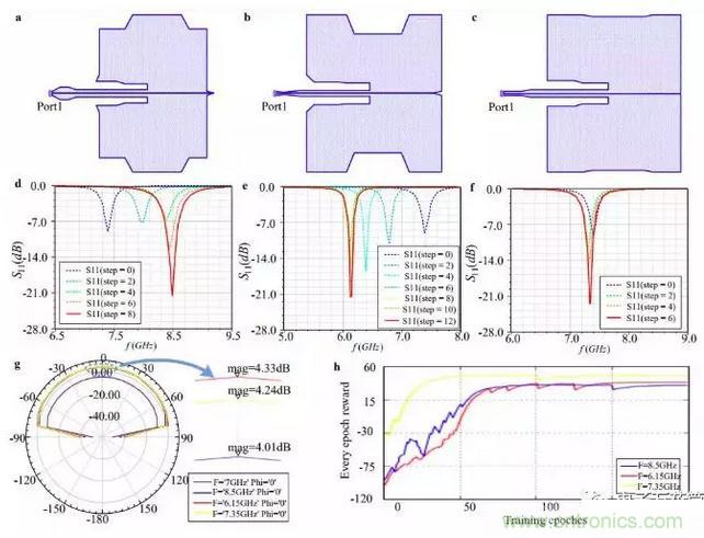圖5:a-c)三種天線模型,其中心頻率分別為8.5GHz、6.15GHz 和7.35GHz,由智能體設(shè)計(jì)。d-f)觀察智能體根據(jù)回波損耗曲線(S11)的變化設(shè)計(jì)天線的過(guò)程。g)所有天線的增益模式。h)三種天線模型的學(xué)習(xí)曲線。