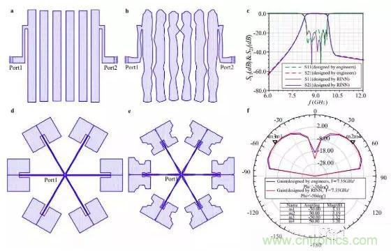 圖6:AI與人類專業(yè)工程師設(shè)計(jì)對(duì)比。a)由工程師設(shè)計(jì)的濾波器模型。b)由AI設(shè)計(jì)的濾波器模型。c)a 的回波損耗曲線(S11)和插入損耗曲線(S21),以及b 的回波損耗曲線(S11)和插入損耗曲線(S21)。d)由工程師設(shè)計(jì)的貼片天線模型。e)由AI設(shè)計(jì)的貼片天線模型。f)a 和b 的7.35 GHz 增益曲線。