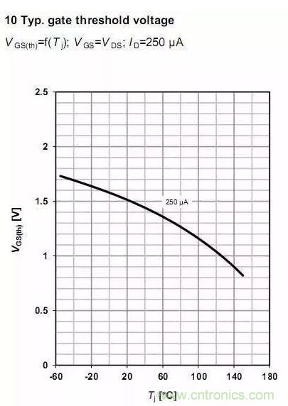 相信這個值大家都熟悉,但是Vgs(th)是負溫度系數(shù)有多少人知道,你知道嗎?(下面兩圖分別來自BSC010NE2LS和IPP075N15N3 G datasheet.)