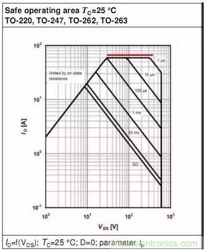 此部分為MOSFET的最大脈沖電流限制,此最大電流對應(yīng)ID_pulse.