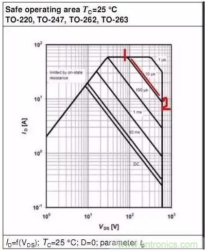 此圖中:當(dāng)VDS=1V時,Y軸對應(yīng)的ID為2A,Rds=VDS/ID=0.5R ==>Tj=150℃時,Rds(on)約為0.5R.當(dāng)VDS=10V時,Y軸對應(yīng)的ID為20A,Rds=VDS/ID=0.5R ==>Tj=150℃時,Rds(on)約為0.5R.所以,此部分曲線中,SOA表現(xiàn)為Tj_max時RDS(on)的限制.