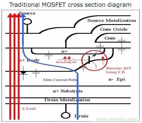 在MOSFET的結(jié)構(gòu)中,實際上是存在一個寄生三極管的,如上圖。在MOSFET的設(shè)計中也會采取各種措施去讓寄生三極管不起作用,如減小P+Body中的橫向電阻RB。正常情況下,流過RB的電流很小,寄生三極管的VBE約等于0,三極管是處在關(guān)閉狀態(tài)。雪崩發(fā)生時,如果流過RB的雪崩電流達到一定的大小,VBE大于三極管VBE的開啟電壓,寄生三極管開通,這樣將會引起MOSFET無法正常關(guān)斷,從而損壞MOSFET。