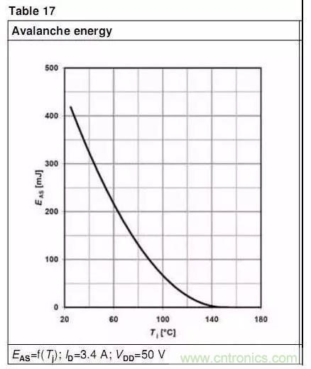 計算出來EAS后,對比datasheet上的EAS值,若在datasheet的范圍內(nèi),則可認為是安全的(當(dāng)然前提是雪崩電流<IAR)同時,還得注意,EAS隨結(jié)溫的增加是減小的,如下圖: