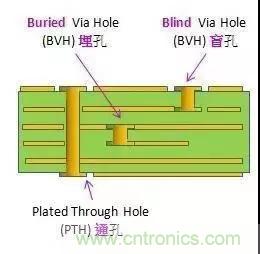這個制作過程不能通過電路板黏合后再進行鉆孔的方式達成,必須要在個別電路層的時候就進行鉆孔操作,先局部黏合內層之后進行電鍍處理,最后全部黏合。由于操作過程比原來的導通孔和盲孔更費勁,所以價格也是最貴的。這個制作過程通常只用于高密度的電路板,增加其他電路層的空間利用率。
