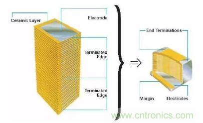 片式多層陶瓷電容器(MLCC),由內(nèi)電極、陶瓷層和端電極三部分組成,其介質(zhì)材料與內(nèi)電極以錯(cuò)位的方式堆疊,然后經(jīng)過高溫?zé)Y(jié)燒制成形,再在芯片的兩端封上金屬層,得到了一個(gè)類似于獨(dú)石的結(jié)構(gòu)體,故MLCC也常被稱為“獨(dú)石電容器”。