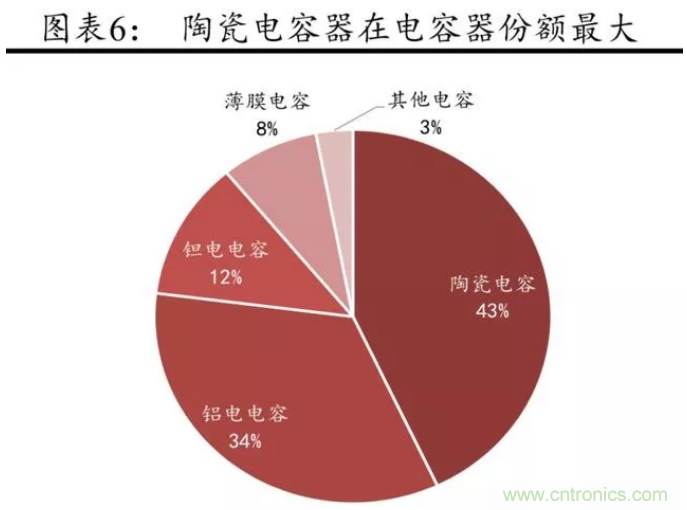 據(jù)中國產(chǎn)業(yè)信息網(wǎng) 2017年 5 月報(bào)道,陶瓷電容器在包括鋁電解電容 器、鉭電解電容器及薄膜電容器在內(nèi)的四類主要電容器中市場份額最高,達(dá)到約43%,是當(dāng)前生產(chǎn)規(guī)模最大、發(fā)展最快的片式元器件之一。