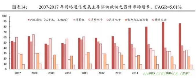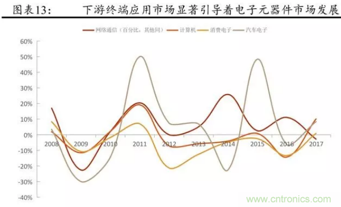 從被動元件的發(fā)展歷程來看,近些年來,產(chǎn)業(yè)鏈下游的需求擴(kuò)大主導(dǎo)著被動元件市場的擴(kuò)張。金融危機(jī)以來,全球電子元件市場規(guī)模的增長主要來自于網(wǎng)絡(luò)通信與汽車電子,尤其是智能手機(jī)。