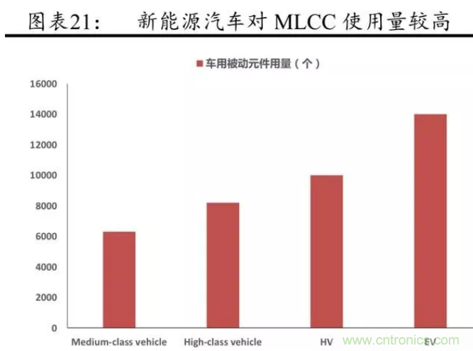 電動汽車對 MLCC 元件的需求量巨大,其中動力系統(tǒng)帶來的MLCC增量較為顯著。據(jù)前瞻研究院的數(shù)據(jù),每輛汽車使用的電子元件,中端車平均為 6300 個(gè),高端車為 8200 個(gè),純電動汽車增加到14000個(gè),其中有一半是 MLCC,這意味著隨著新能源汽車的不斷普及,MLCC 需求量會不斷增長。