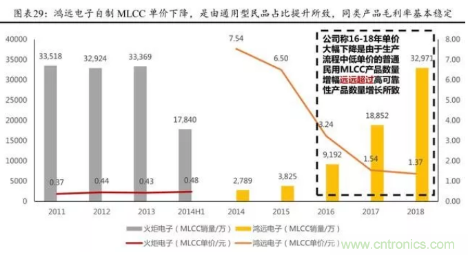 從各企業(yè)生產(chǎn) MLCC 價(jià)值量看,2014H1 火炬電子生產(chǎn)陶瓷電容 器平均單價(jià)為 0.46 元, 而鴻遠(yuǎn)電子 2014 年MLCC平均單價(jià)為 7.54 元,近幾年呈現(xiàn)下降趨勢, 我們判斷,整體主要是因?yàn)樽灾撇糠滞ㄓ眯兔衿返臄?shù)量占比略有提升。
