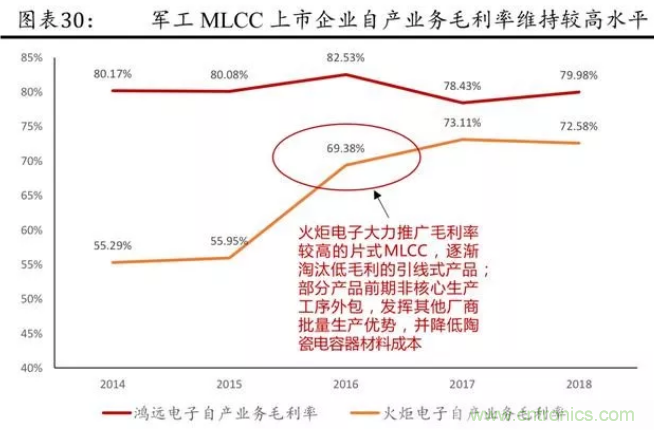 自產(chǎn)自銷模式中,在軍用領(lǐng)域,MLCC 因主要采用定制供應(yīng)商目錄的管理模式,且需要獲得一系列嚴(yán)格的資質(zhì)審查,且軍用高可靠 MLCC 對產(chǎn)品性能、可靠性及供貨穩(wěn)定性有著更高或更特殊的要求等,具有較高的市場壁壘,毛利率水平一般可以達(dá)到 70%~80%,代表廠商有鴻遠(yuǎn)電子、火炬電子等,顯著高于民品。