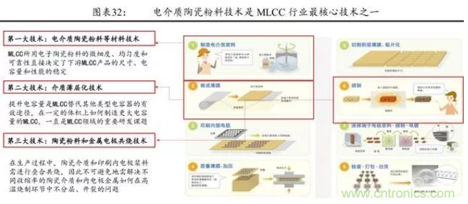 電介質(zhì)陶瓷粉料 的材料技術(shù)、介質(zhì)薄層化技術(shù)、陶瓷粉料和金屬電極的共燒技術(shù)被譽(yù) 為 MLCC 行業(yè)最核心的三大技術(shù)。