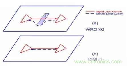 在 PCB 設(shè)計(jì)中一個(gè)常見的錯(cuò)誤是在層間打過(guò)孔和開槽。圖3顯示了當(dāng)一條信號(hào)線在一個(gè)開過(guò)槽的不同層上的電流流向?;芈冯娏鲗⒈黄壤@過(guò)開槽,這就必然會(huì)產(chǎn)生一個(gè)大的環(huán)流回路。