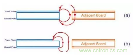 在板卡的邊緣存在電源平面層對(duì)地平面層的輻射效應(yīng)。從邊沿泄漏的電磁能量將破壞臨近的板卡。見下圖4a。適當(dāng)?shù)臏p少電源平面層的面積(圖4 b),以至于地平面層在一定的區(qū)域內(nèi)交疊。這將減少電磁泄漏對(duì)鄰近板卡的影響。