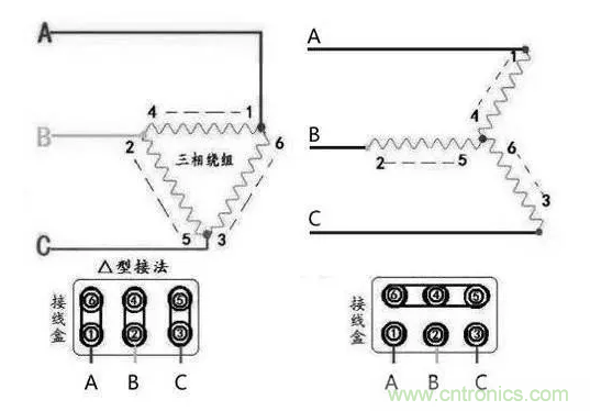 星型就是三個(gè)繞組的尾端連到一起,三角形是三個(gè)繞組首尾連接