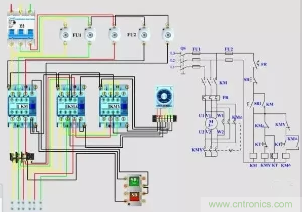 熱過(guò)載繼電器和主電源接觸器連接,三相相序相同,上圖黃綠紅為主線部分,黑色線為二次線控制線部分。