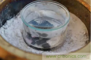 首先把要拆解的芯片放置在裝了濃硫酸的容器里,容器需要蓋住,但不能嚴實,這樣里面的氣體才能漫溢出來。把容器里的濃硫酸加熱到沸騰(大約 300 攝氏度),在瓶底的周圍鋪上蘇打粉——用來預防意外飛濺出來的硫酸液和冒出來的硫酸氣體。