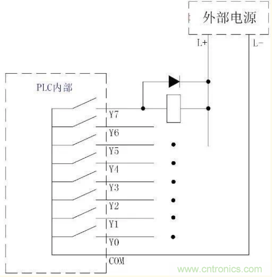 PLC繼電器輸出電路的形式繼電器觸點(diǎn)的使用壽命也有限制(一般數(shù)十萬次左右,根據(jù)負(fù)載而定,如連接感性負(fù)載時(shí)的壽命要小于阻性負(fù)載)。此外,繼電器輸出的響應(yīng)時(shí)間也比較慢(10ms)左右,因此,在要求快速響應(yīng)的場(chǎng)合不適合使用此種類型的電路輸出形式(可以根據(jù)場(chǎng)合使用下面介紹的兩種輸出形式)。