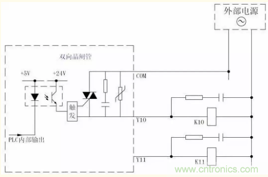 雙向晶閘管輸出的驅(qū)動(dòng)能力要比繼電器輸出的要小,允許負(fù)載電壓一般為AC85~242V;單點(diǎn)輸出電流為0.2A~0.5A,當(dāng)多點(diǎn)共用公共端時(shí),每點(diǎn)的輸出電流應(yīng)減?。ㄈ鐔吸c(diǎn)驅(qū)動(dòng)能力為0.3A的雙向晶閘管輸出,在4點(diǎn)共用公共端時(shí),最大允許輸出為0.8A/4點(diǎn))。
