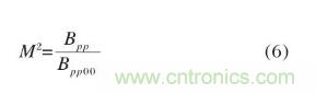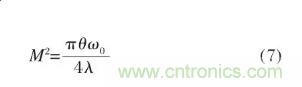 式中:Bpp為實(shí)際光參量乘積;Bpp00為高斯光參量乘積;光束質(zhì)量因子M2表征實(shí)際光束相比衍射極限(基模高斯光束)的倍數(shù),將基模高斯光束的束散角θ0=4λ/πω0及公式(4)代入公式(6),則可得: