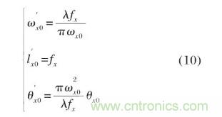設(shè)圖3中X型柱面鏡為薄透鏡,焦距為fx,且焦點(diǎn)位于LD高斯光束的束腰位置,由公式(1)、(2)可得,在透鏡處的入射光束波前曲率半徑及腰斑半徑為: