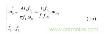 輸出透鏡L2的焦距為f2,其焦點(diǎn)位于ω0″處,由公式(8)可知,擴(kuò)束單元輸出光束的束腰半徑及位置為: