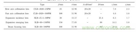 仿真時(shí)使用SIGMA KOKI公司生產(chǎn)的透鏡,表2列出了透鏡的參數(shù),其中f為焦距,r為曲率半徑,A×B為柱面透鏡長(zhǎng)×寬,D為球面透鏡直徑,te為透鏡邊緣厚度,tc為透鏡中心厚度。