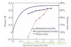 實(shí)驗(yàn)時(shí),對(duì)LD加載4.0V的偏置電壓,使用激光功率計(jì)測(cè)量LD的輸出功率為376mW。為獲得光束整形后的功率密度,以光斑中心為圓心,測(cè)量不同直徑圓內(nèi)多個(gè)點(diǎn)的激光功率并取平均值,通過(guò)差分計(jì)算出相鄰?fù)膱A所形成的圓環(huán)內(nèi)激光功率及圓環(huán)面積,二者求比值,得到不同圓環(huán)內(nèi)的平均激光功率密度。文中測(cè)量的光斑直徑為1.00、1.25、1.50、1.75、2.00、2.25、2.50mm。圖12橙線為平均激光功率密度離散值所繪制的折線圖,其趨勢(shì)表明光斑半徑越大,激光功率密度越小。藍(lán)線為擬合離散數(shù)據(jù),為高斯曲線,近似代表聚焦透鏡焦點(diǎn)處光斑功率密度的整體分布。圖13是不同光斑直徑下激光功率仿真結(jié)果(藍(lán)色曲線)與實(shí)驗(yàn)結(jié)果(藍(lán)色折線)的對(duì)比,實(shí)驗(yàn)結(jié)果與仿真結(jié)果基本吻合。紅色折線為不同直徑光斑內(nèi)激光功率同二極管輸出總功率之比。由圖13可知,1mm直徑圓內(nèi)激光功率為252mW,約占LD出射光束總功率的67%。說(shuō)明光束整形系統(tǒng)在實(shí)現(xiàn)提高激光功率密度的同時(shí)具備較高的功率傳輸效率。