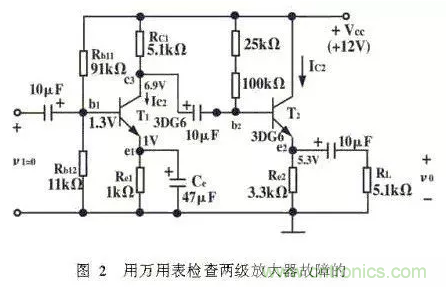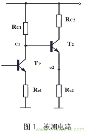 用同一臺測量儀器進行測量時,測量點不同,儀器內阻引進的誤差大小將不同。例如,對于圖1所示電路,測C1點電壓VC1時,若選擇e2為測量點,測得VE2,根據(jù)VCl=VE2+VBE2求得的結果,可能比直接測Cl點得到的VC1的誤差要小得多。所以,出現(xiàn)這種情況,是因為Re2較小,儀器內阻引進的測量誤差小。