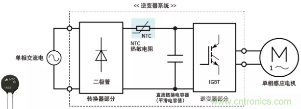 逆變器系統(tǒng)主要由轉(zhuǎn)換器級、逆變器級和直流側(cè)電容(平滑電容)組成,該電容放置在轉(zhuǎn)換器級之后,如下所示。上電時,器件會通過沖擊電流進(jìn)行充電,而該沖擊電流的峰值是(為直流側(cè)電容充電的)穩(wěn)定電流的若干倍。該沖擊電流可能會對直流電容的使用壽命產(chǎn)生不利影響,或損壞半導(dǎo)體器件。為了防止沖擊電流,我們需要連接NTC熱敏電阻。