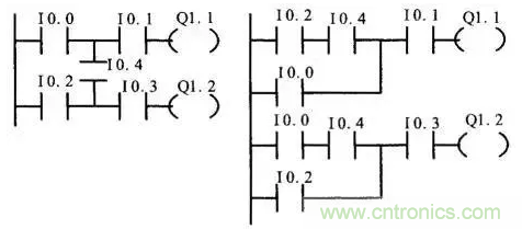 (3)幾個串聯(lián)支路相并聯(lián),應將觸點多的支路安排在上面;幾個并聯(lián)回路的串聯(lián),應將并聯(lián)支路數(shù)多的安排在左面。按此規(guī)則編制的梯形圖可減少用戶程序步數(shù),縮短程序掃描時間。