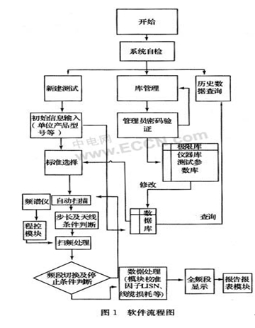 b.軟件構(gòu)成及功能:本軟件功能采用模塊化方法實現(xiàn)主要由界面參數(shù)輸入及數(shù)據(jù)顯示模塊、數(shù)據(jù)庫管理模塊、程控及自檢模塊、報告報表模塊組成。本EMI標(biāo)準(zhǔn)自動測試軟件具備以下功能:①參數(shù)設(shè)置,包括測試標(biāo)準(zhǔn)的選擇,測試配置的提示,測試參數(shù)的設(shè)置,如測試頻段、測量帶寬、檢波方式、掃頻步進量、參考電平、分辨率帶寬、掃頻方式、傳感器系數(shù)、電纜損耗、衰減/放大器等;②控制儀器(頻譜分析儀)以一定的步長和速率對信號進行掃頻測量、判別和讀出數(shù)據(jù);③數(shù)據(jù)處理能力.電磁輻射自動測量軟件能夠自動將測量的信號電壓轉(zhuǎn)換成干擾的量值,即自動補償因傳感器的使用而引起的隨頻率變化的校準(zhǔn)系數(shù),并可用線性或?qū)?shù)頻率坐標(biāo)顯示出信號的頻率分布,同時自動與相應(yīng)極限值進行比較,判別信號是否超標(biāo)并在圖中表示出信號頻譜與極限值的關(guān)系;④數(shù)據(jù)的存儲和輸出能力,軟件可以將每次的測量數(shù)據(jù)以數(shù)據(jù)庫文件的形式進行保存,需要時提取,特別是傳感器系數(shù)和測試極限值都以數(shù)據(jù)文件的形式保存,便于數(shù)據(jù)處理和查詢時調(diào)用。⑤數(shù)據(jù)庫管理功能。主要對各標(biāo)準(zhǔn)的極限值,天線校準(zhǔn)因子等進行數(shù)據(jù)管理。系統(tǒng)工作流程圖如圖1所示。