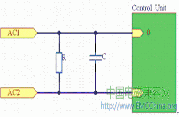 為了防止控制板電路產(chǎn)生的傳導(dǎo)干擾,可在電路的進入口(即AC兩端)并接上一個電容C,圖1所示是一個簡單的電容抗擾電路連接圖。圖中的電容屬于安全電容,但必須在該電容的兩端并聯(lián)一個安全電阻,以防止電源線拔插時電源線插頭長時間帶電。因為安全標準規(guī)定,當正在工作之中的機器電源線被拔掉時,在兩秒鐘內(nèi),電源線插頭兩端所帶的電壓(或?qū)Φ仉娢?應(yīng)小于原來電壓的30%。