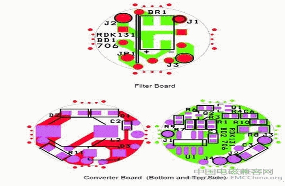 雖然該設(shè)計(jì)具有功能性,但仍存在傳導(dǎo)輻射問題。由于兩個(gè)PCB比較接近,開關(guān)電流會(huì)從轉(zhuǎn)換器電路板耦合到EMI濾波器電路板,從而降低EMI濾波器的性能。通過(guò)在這兩個(gè)電路板之間放置“屏蔽”PCB,這一問題便得以解決。而第三個(gè)電路板只是一層銅,并無(wú)電路。它被電氣連接到EMI濾波器負(fù)輸出端與轉(zhuǎn)換器負(fù)輸入端的接合處。這樣,總裝便由三個(gè)疊加在一起的圓形電路板組成。增加第三個(gè)電路板既簡(jiǎn)單又節(jié)省成本,不但解決了耦合問題,還達(dá)到了EMI性能要求。