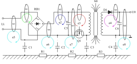 圖8是磁感應產(chǎn)生傳導干擾的原理圖,圖8表示開關電源變壓器產(chǎn)生的漏磁通穿過其它電路時,在其它電路中也產(chǎn)生感應電動勢,其中漏磁通M1、M2、M3產(chǎn)生的感應電動勢e1、e2、e3屬于是差模干擾信號;M5、M6、M7、M8產(chǎn)生的感應電動勢e5、e6、e7、e8屬于是共模干擾信號。