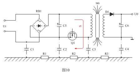 值得一提的是,開關電源變壓器初級線圈的漏感產(chǎn)生的反電動勢et,在所有干擾信號之中是最不容忽視的,如圖10所示。當電源開關管關斷的時候,開關電源變壓器初級線圈的漏感產(chǎn)生的反電動勢et幾乎沒有回路可釋放,一方面,它只能通過初級線圈的分布電容進行充電,并讓初級線圈的分布電容與漏感產(chǎn)生并聯(lián)諧振;另一方面,它只能通過輻射向外進行釋放,其中通過對地電容C3與大地相連,也是反電動勢et釋放能量的一個回路,因此,它對輸入端也會產(chǎn)生共模信號干擾。