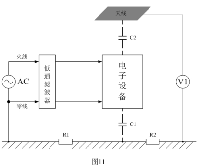 輻射干擾一般是通過電磁感應的形式在空間進行傳播的,圖11是測試電子設備產(chǎn)生輻射干擾的基本方法,或表示電子設備產(chǎn)生的干擾信號通過電磁感應向空中輻射的原理。圖11中,電子設備表示干擾信號源,V1表示測量儀表,C1表示電子設備對大地的電容,C2表示電子設備與天線偶合的電容,即:電子設備通過電場對天線產(chǎn)生感應,這里的天線也可以看成是被干擾的設備。圖11的測試方法就是測試電子設備周圍規(guī)定距離某處的電磁場強度,由于干擾信號一般都是一個頻率成份非常豐富的非正弦波,因此,無法對它進行直接測量,只能對它其中某一個頻率信號單獨進行測量。