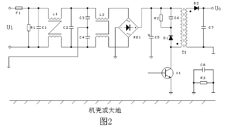 圖1 是一個(gè)普遍應(yīng)用的反激式(或稱為回掃式)開(kāi)關(guān)電源工作原理圖,50Hz 或60Hz 交流電網(wǎng)電壓首先經(jīng)整流堆整流,并向儲(chǔ)能濾波電容器C5 充電,然后向變壓器T1與開(kāi)關(guān)管V1組成的負(fù)載回路供電。圖2 是進(jìn)行過(guò)電磁兼容設(shè)計(jì)后的電原理圖。