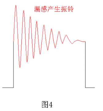 由于變壓器的初級有漏感,當(dāng)電源開關(guān)管V1由飽和導(dǎo)通到截止關(guān)斷時會產(chǎn)生反電動勢,反電動勢又會對變壓器初級線圈的分布電容進(jìn)行充放電,從而產(chǎn)生阻尼振蕩,即產(chǎn)生振鈴,如圖4所示。變壓器初級漏感產(chǎn)生反電動勢的電壓幅度一般都很高,其能量也很大,如不采取保護(hù)措施,反電動勢一般都會把電源開關(guān)管擊穿,同時反電動勢產(chǎn)生的阻尼振蕩還會產(chǎn)生很強(qiáng)的電磁輻射,不但對機(jī)器本身造成嚴(yán)重干擾,對機(jī)器周邊環(huán)境也會產(chǎn)生嚴(yán)重的電磁干擾。