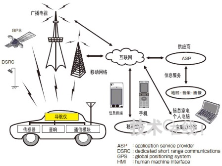 首先介紹車載導(dǎo)航儀的多功能化和高速化。眾所周知,車載導(dǎo)航儀的出發(fā)點(diǎn)是導(dǎo)航,然后才是通過DSRC(Dedicated Short Range Communications )、電視、移動網(wǎng)絡(luò)等通信手段與車外相連接。現(xiàn)在,車載導(dǎo)航儀已不再是單純的指路工具,而是發(fā)展成為了能夠借助各類供應(yīng)商進(jìn)行多種內(nèi)容交換的雙向交流裝置。為了向駕駛員提供安全、放心、便利、舒適的駕駛環(huán)境,車載導(dǎo)航儀正在向聯(lián)結(jié)人與機(jī)械(這里指汽車)的HMI(Human Machine Interface)中心轉(zhuǎn)變(圖1)。
