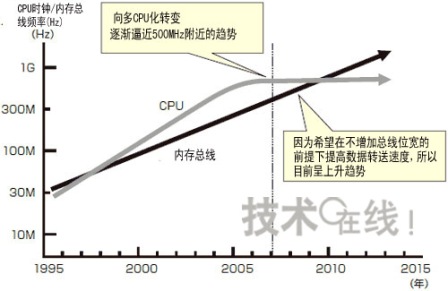 其原動力毋庸置疑是CPU的進(jìn)步(即計(jì)算機(jī)系統(tǒng)的大規(guī)?;蜁r(shí)鐘的高速化)。車載導(dǎo)航儀的CPU時(shí)鐘和內(nèi)存總線時(shí)鐘頻率近來得到了快速提高(圖4)。CPU時(shí)鐘頻率正在逼近上限,今后,提高性能可能要依賴在一個(gè)LSI內(nèi)配置多個(gè)CPU的多CPU化進(jìn)程。而另一方面,DRAM的內(nèi)存總線還在以不增加位寬的前提下提高性能,因此,時(shí)鐘頻率的上升勢不可擋。