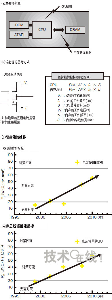 芯片面積和時(shí)鐘頻率的增加容易導(dǎo)致輻射電磁噪聲增大。因此,對這些輻射源的輻射進(jìn)行預(yù)測管理會逐漸成為重要環(huán)節(jié)。對于車載導(dǎo)航儀的核心(Navi-Core),如圖5(a)所示,CPU和總線是主要輻射源。由經(jīng)驗(yàn)可知,直接來自于CPU的輻射能指標(biāo)Pc與工作電壓的平方、工作頻率、芯片面積分別成正比,這些數(shù)值的積被作為“輻射能指標(biāo)”應(yīng)用到了預(yù)測管理(圖5(b)注1)之中。內(nèi)存總線的輻射能指標(biāo)Pm也同樣與工作電壓的平方、工作頻率、內(nèi)存總線位寬的積成正比。[page]