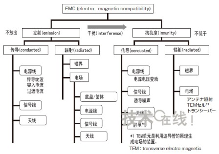 圖6給出的樹形圖對于理解EMC的整體結(jié)構(gòu)很有幫助,本公司的內(nèi)部培訓(xùn)也經(jīng)常使用。這是按照發(fā)射/抗擾度、傳導(dǎo)/輻射的組合,把EMC分成四個(gè)大類進(jìn)行整理的方法。其中,在設(shè)計(jì)階段的EMC研究和測量精度方面,尤其需要注意的是電場的輻射。