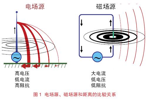 如果電荷作加速或減速運(yùn)動或者電流增大或減小,就會產(chǎn)生變化的磁場。如此一來就會產(chǎn)生變化的電場,源就會輻射出電磁能量了。電磁能量既可以產(chǎn)生于高阻抗的電場源(高電壓-小電流)也可以產(chǎn)生于低阻抗的磁場源(大電流-低電壓)。如圖1 所示的單極天線和環(huán)天線就是這兩種源的典型代表。