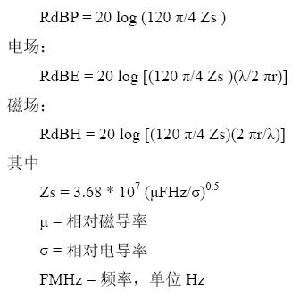 高阻抗源(電場)的波阻抗會大于120π 歐姆,而且它會隨著間隔距離的增大而逐漸減小,直到極限值。由此,有三個等式被用于計(jì)算屏蔽體表面的反射。這些等式假設(shè)Zw/Zs 或Zs/Zw >10。當(dāng)λ/2πr或2πr/λ=1 時(shí),電場和磁場等式就變得和平面波的等式一致了。