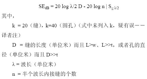 雖然縫隙的形狀各異,但如果能夠?qū)⑵帘涡芤暈楹偷刃螤羁p隙天線的輻射效率相反的問題,就可以得到一個簡單的模型來計(jì)算最壞情況下縫隙的屏蔽效能。雖然這種假設(shè)也會導(dǎo)致一些錯誤,但對設(shè)計(jì)而言就足夠了,因?yàn)閷?shí)際的屏蔽效能會高于計(jì)算給出的結(jié)果。最大開口尺寸為D 的單縫隙的屏蔽效能由下面等式的第一部分給出。等式的第二部分是對多個同樣尺寸縫隙情況的修正。
