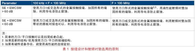 在這種情況下,反射(R)所要求的材料厚度約為集膚深度,因此它和材料的厚度基本無關(guān),尤其是在更高的頻率上。如果較低頻率上的反射已經(jīng)足夠,則材料選擇結(jié)束。如果不夠,就可以通過令其吸收損耗(A)滿足A+R = SE+EMCSM 來計(jì)算其所需的厚度(t)。如果計(jì)算得到的厚度(t)小于設(shè)計(jì)的最大允許厚度,則本過程結(jié)束。否則,增加厚度并/ 或者改用導(dǎo)磁材料,重復(fù)計(jì)算。最后,只要材料的特性確定,就可以根據(jù)表1 所總結(jié)出的衰減與頻率之間的關(guān)系來選擇接縫設(shè)計(jì)和射頻襯墊,并完成整個設(shè)計(jì)。