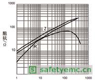 鐵氧體的效果隨著頻率的升高而增加。鐵氧體扼流圈的阻抗在10MHz處通常為幾十歐姆,當(dāng)頻率超過100MHz時,阻抗升高到數(shù)百歐姆(具體值取決于形狀和尺寸,鐵氧體體積越大,阻抗越大)。不同廠家的產(chǎn)品或同一廠家的不同種類的鐵氧體,其阻抗隨頻率的變化都有所不同。圖5是尺寸相同(外徑為5mm,長度為11mm)但材料不同的兩種鐵氧體的特性。