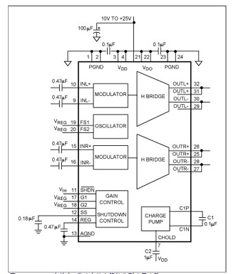 有些低開(kāi)關(guān)頻率(200kHz至300kHz)應(yīng)用不適合采用圖5c所示的方案。對(duì)于這類產(chǎn)品可能需要采用其他方法和拓?fù)浣Y(jié)構(gòu)。MAX9704立體音D類放大器(圖6)可設(shè)置為940kHz固定頻率模式(FFM)(FS1=低,F(xiàn)S2=高),此時(shí)效果最佳。工作在FFM模式下的MAX9704通過(guò)引腳選擇將開(kāi)關(guān)周期設(shè)為恒定值(具有三個(gè)可選項(xiàng)),以滿足應(yīng)用需求。