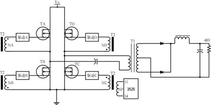 實際電路都是由非理想元件組成的,在設(shè)計中可能會遇到許多預(yù)料不到的情況。在調(diào)試如圖1所示的普通全橋電源時,輸出不是料想中平穩(wěn)的波形,而是不時發(fā)生間歇振蕩,并發(fā)出“吱吱”聲,有時甚至?xí)龤ч_關(guān)管。對電路進行分析后未發(fā)現(xiàn)結(jié)構(gòu)上可能導(dǎo)致不穩(wěn)定的因素,于是改變輸出采樣的電壓比,將輸出調(diào)定在半電壓24V上,使用90V的輸入直流電壓,在保證功率管安全的情況下進行調(diào)試。待電路工作正常后,再緩慢升高輸入直流電壓,經(jīng)過多次試驗,發(fā)現(xiàn)當(dāng)Ui為180~250V時就可能引發(fā)振蕩,最后判定是驅(qū)動變壓器各個繞組之間的分布電容在搗亂。