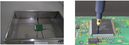 該方法用于測(cè)量由集成電路輸出到線路板引線上的射頻電流引起的電磁輻射,與該激勵(lì)電流有關(guān)的引線、電源層和地層以及與線路板相連的電纜起到了發(fā)射天線的作用,產(chǎn)生的場(chǎng)強(qiáng)的大小與該電流成正比。線路板的設(shè)計(jì),虛擬天線的發(fā)射效率,射頻電流的耦合因子等因數(shù)也會(huì)影響最終場(chǎng)強(qiáng)的大小,而集成電路的射頻電流是產(chǎn)生電磁輻射的根源。所以測(cè)量集成電路產(chǎn)生的射頻電流可作為評(píng)價(jià)集成電路、PCB板及系統(tǒng)EMC特性的一個(gè)方法。采用一個(gè)微型磁場(chǎng)探頭在被測(cè)線路(如電源線或I/O線)上的特定位置測(cè)量其磁場(chǎng)就可經(jīng)計(jì)算得出被測(cè)引線上的電流大小。在該磁場(chǎng)探頭放置精確的情況下用這種方法所得的測(cè)試結(jié)果的可重復(fù)性比較高。